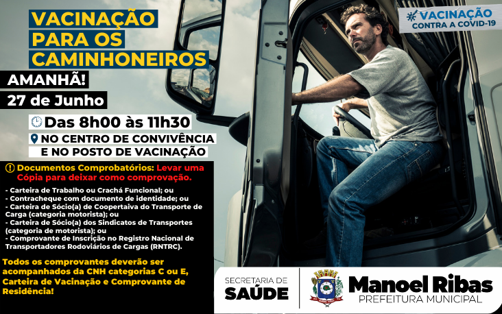 ESSE DOMINGO É DIA DE VACINAÇÃO PARA OS CAMINHONEIROS - Motoristas de transporte rodoviário de cargas (de todas as idades, com a comprovação dentro dos requisitos citados na imagem)!