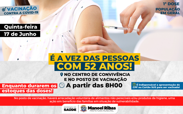 Chegou a vez das pessoas com 52 anos! Mas ATENÇÃO! Estamos com poucas doses, então a vacinação ocorrerá enquanto durarem os estoques da doses!