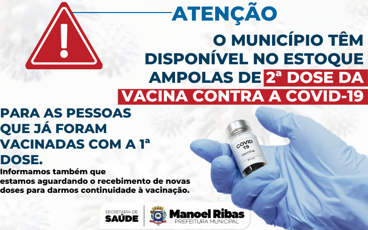 ATENÇÃO! A Prefeitura de Manoel Ribas informa que ainda há disponível no estoque ampolas de 2ª dose da vacina contra a Covid-19 para as pessoas que já foram vacinadas com a 1ª dose.