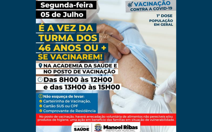 A Prefeitura de Manoel Ribas amplia a vacinação para pessoas com 46 anos ou mais a partir de AMANHÃ, 05 de Junho!
