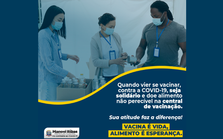 Ajude quem precisa! Quando vier se vacinar contra a Covid-19, retribua de forma voluntária e doe um alimento não perecível e/ou produtos de higiene para a campanha Vacina Solidária no Posto de Vacinação da Covid-19. Assim como a vacina salva vidas, a sua ajuda também! Doe alimento, combata a fome.