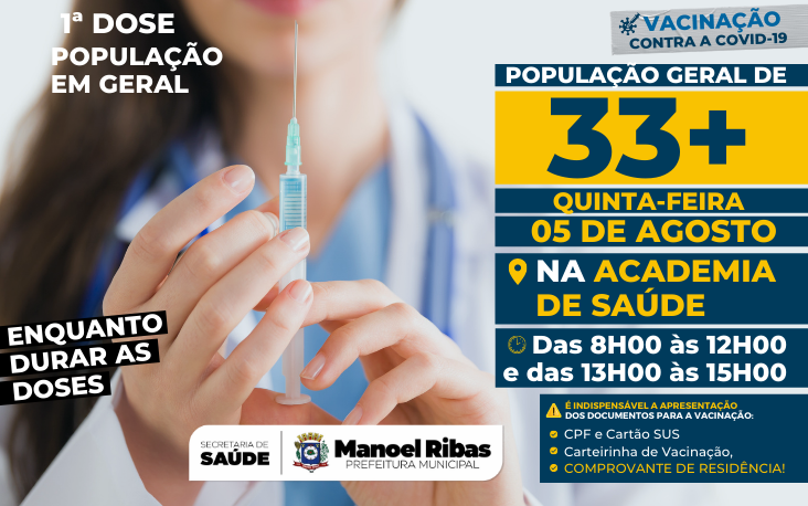 ATENÇÃO! ESTAMOS COM POUCAS DOSES, MAS AVANÇAMOS PARA A POPULAÇÃO GERAL DE 33 ANOS OU +!