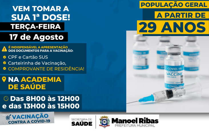 Amanhã, TERÇA-FEIRA, 17 de Agosto, das 8H00 às 12H00 e das 13H00 às 15H00, na Academia de Saúde. VEM SE VACINAR!