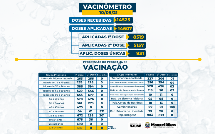 Temos 9.450 pessoas vacinadas em Manoel Ribas, 69,95% da população estimada. Segundo a última atualização (10/09/2021), 8.519 1ª doses foram aplicadas, 5.157 2ª doses aplicadas e 931 doses únicas aplicadas desde o início da campanha de vacinação na cidade. No total, foram 14.607 doses aplicadas.