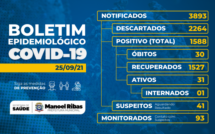 Informamos que não foram diagnosticados novos casos de COVID-19 em Manoel Ribas.