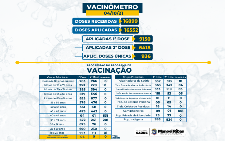 Temos 10.086 pessoas vacinadas em Manoel Ribas, 76,69% da população estimada. Segundo a última atualização (04/10/2021), 9.150 1ª doses foram aplicadas, 6.418 2ª doses aplicadas e 931 doses únicas aplicadas desde o início da campanha de vacinação na cidade. No total, foram 16.552 doses aplicadas.
