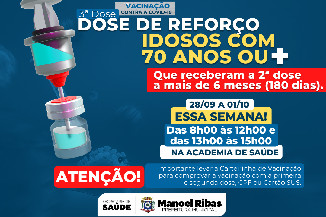 IDOSOS DE 70 ANOS OU MAIS QUE TOMARAM A 2ª DOSE DA VACINA A MAIS DE 6 MESES (180 DIAS), chegou a hora da sua dose de reforço!