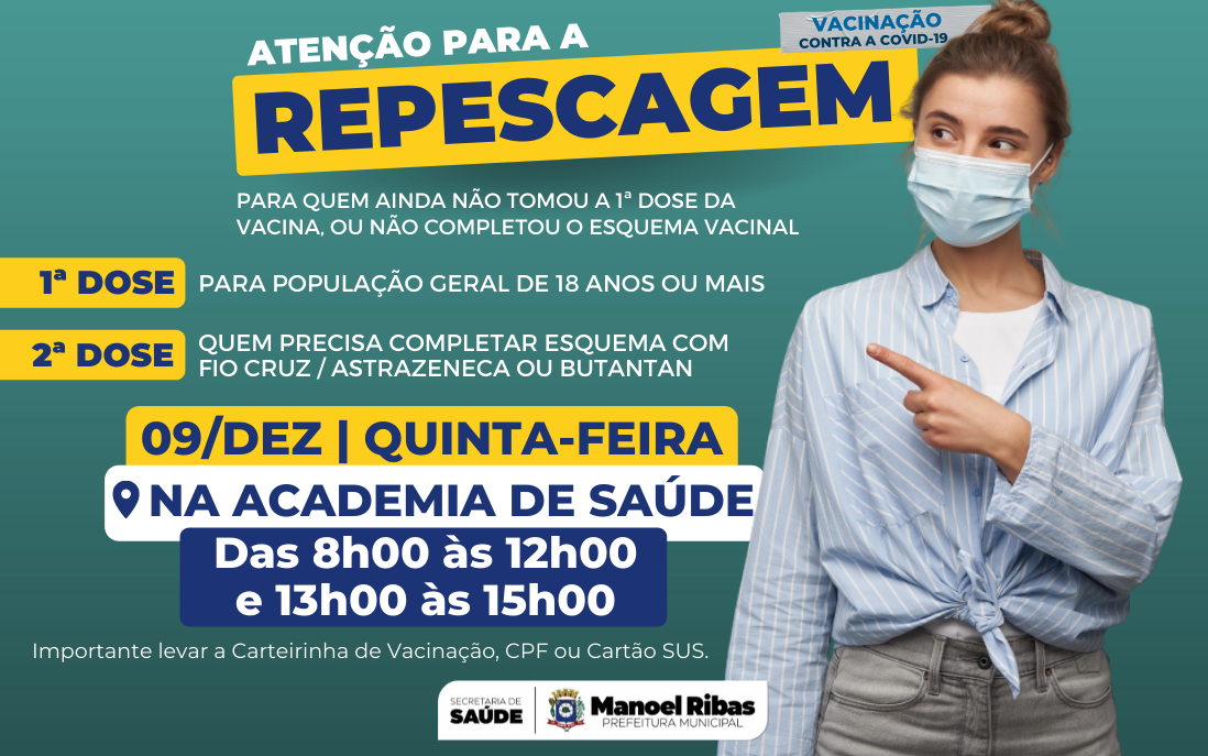 Toda população adulta, a partir dos 18 anos completos, que perderam sua etapa de vacinação para a primeira e segunda dose, poderá se encaminhar até a Academia de Saúde, nesta QUINTA-FEIRA, 09 de Dezembro, para se imunizar. A vacinação será oferecida das 08h00 às 12h00 e das 13h00 até as 15h00h.