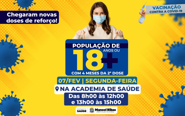 Chegaram novas doses de reforço! 3ª Dose da vacina contra a Covid-19. Para toda a população com 18 anos ou mais.