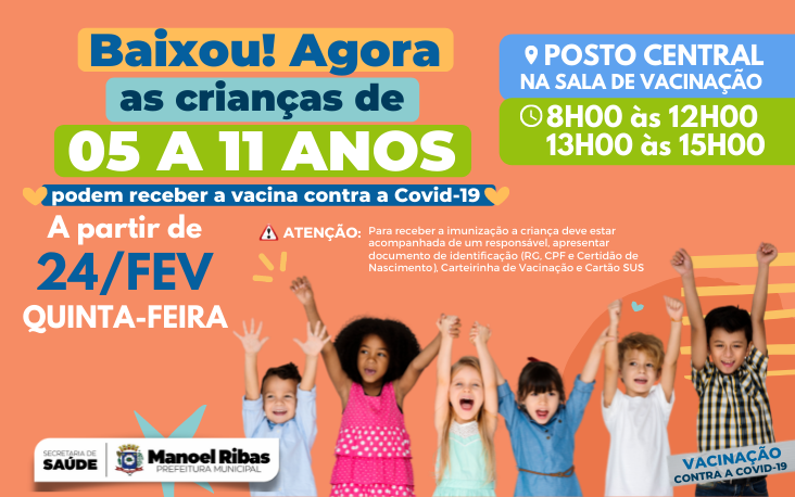 Ah! Lembre-se: para receber a imunização, a criança de estar acompanhada de um responsável, apresentar documento de identificação (RG, CPF e Certidão de Nascimento), Carteirinha de Vacinação e Cartão SUS.