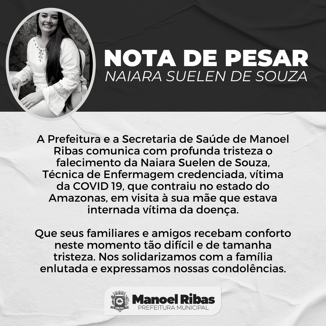 A Prefeitura e a Secretaria de Saúde de Manoel Ribas comunica com profunda tristeza o falecimento da Naiara Suelen de Souza, Técnica de Enfermagem credenciada, vítima da COVID 19, que contraiu no estado do Amazonas, em visita à sua mãe que estava internada vítima da doença.
