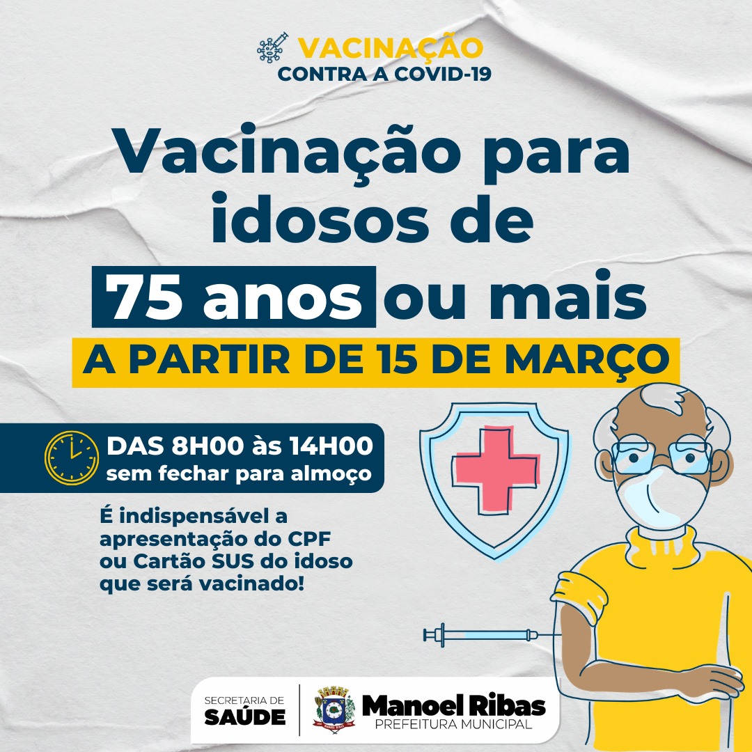 Vamos avançar na campanha de vacinação contra a COVID-19 e começar a vacinar nesta segunda-feira, 15 de março, os idosos de 75 anos ou mais.