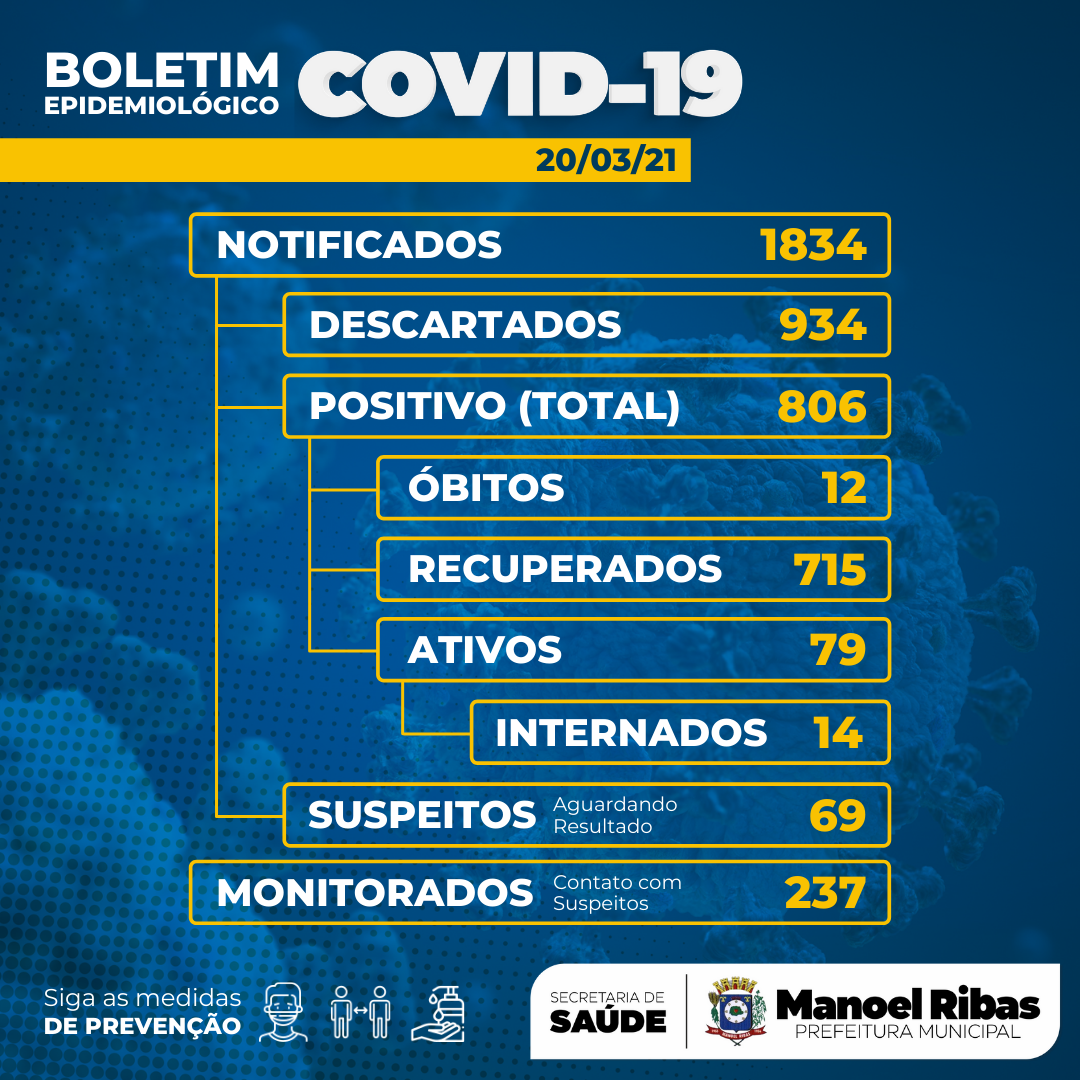 Informamos que foram diagnosticados mais 07 novos casos de COVID-19 em Manoel Ribas, sendo 03 pacientes do sexo feminino e 04 pacientes do sexo masculino, com idades entre 17 e 67 anos, todos em isolamento e monitoramento domiciliar. Ocorreram mais 04 internamentos hospitalares de pacientes positivos para COVID-19.
