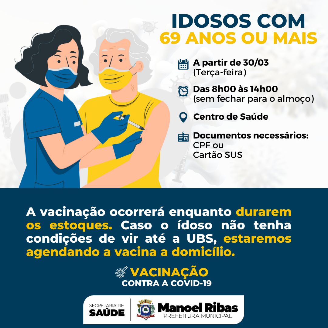 Vamos avançar na campanha de vacinação contra a COVID-19 e começar a vacinar nesta terça-feira, 30 de março, os idosos de 69 anos ou mais.