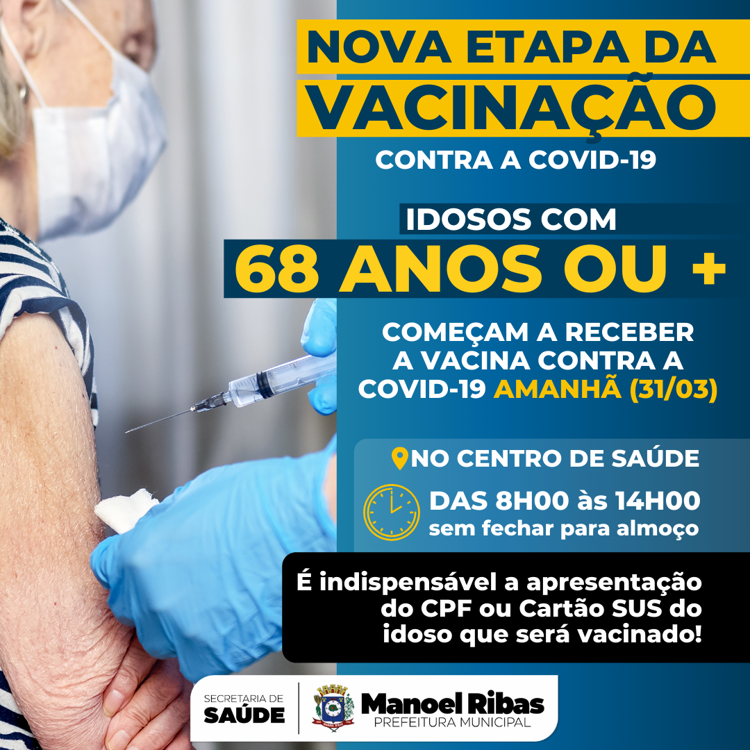 Atenção, chegou a hora dos idosos com 68 anos ou mais prepararem o braço para receber a imunização! SEJA GENTIL e leve seus pais, familiares e vizinhos dessa faixa etária para serem vacinados! Serão vacinados à domicílio somente os idosos acamados. PRECISAMOS DA SUA AJUDA!