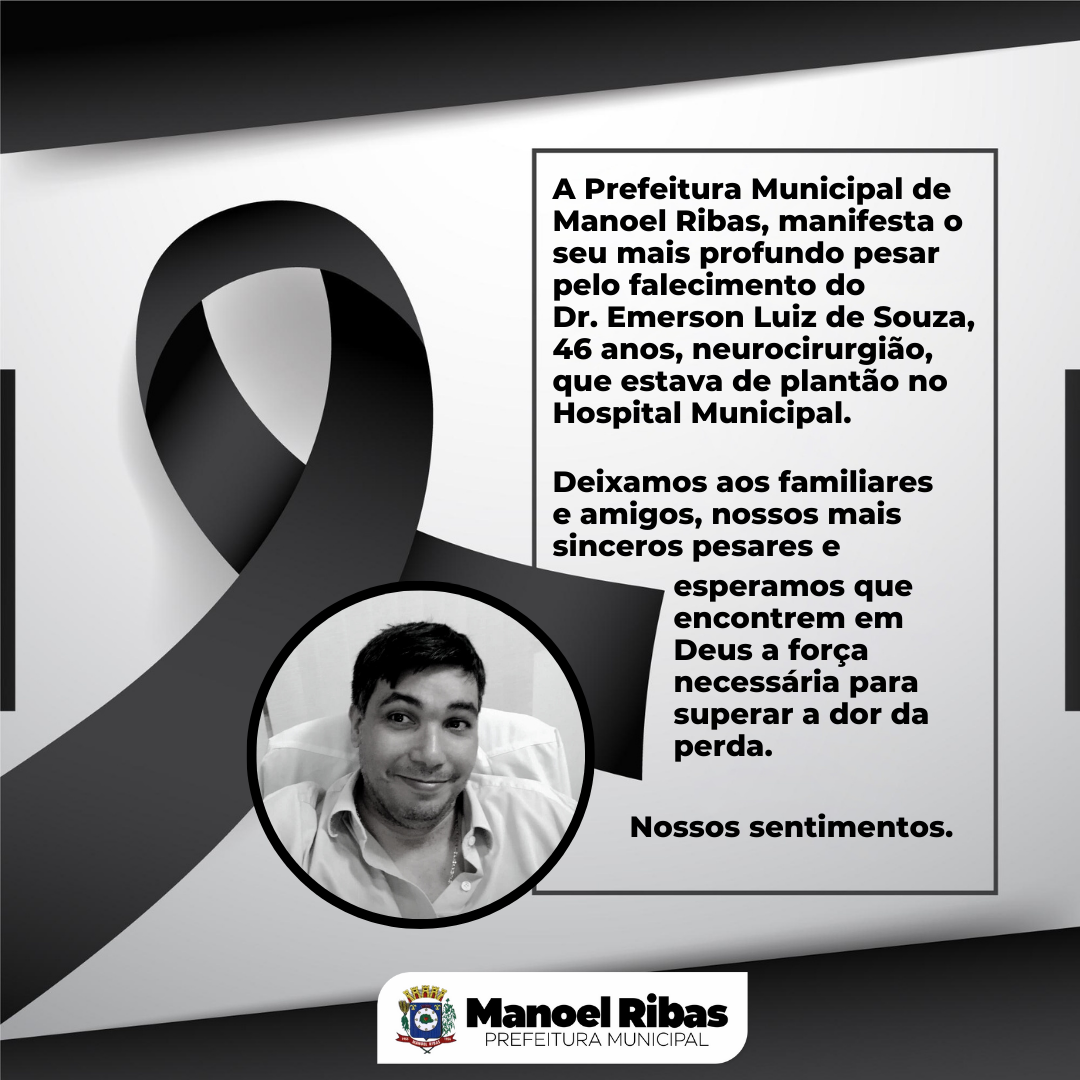 A Prefeitura Municipal de Manoel Ribas, manifesta o seu mais profundo pesar pelo falecimento do Dr. Emerson Luiz de Souza, 46 anos, neurocirurgião, que estava de plantão no Hospital Municipal.