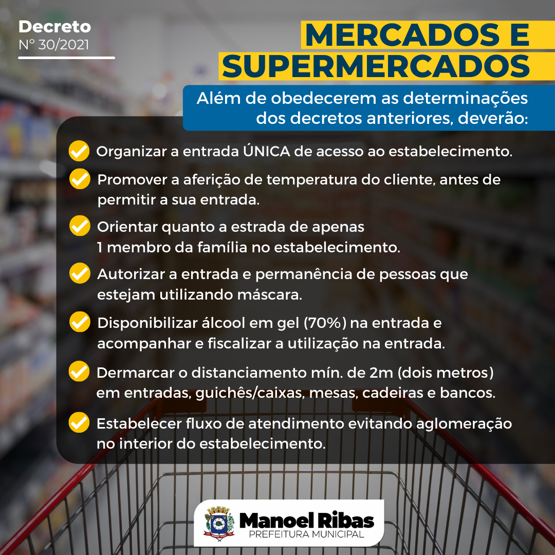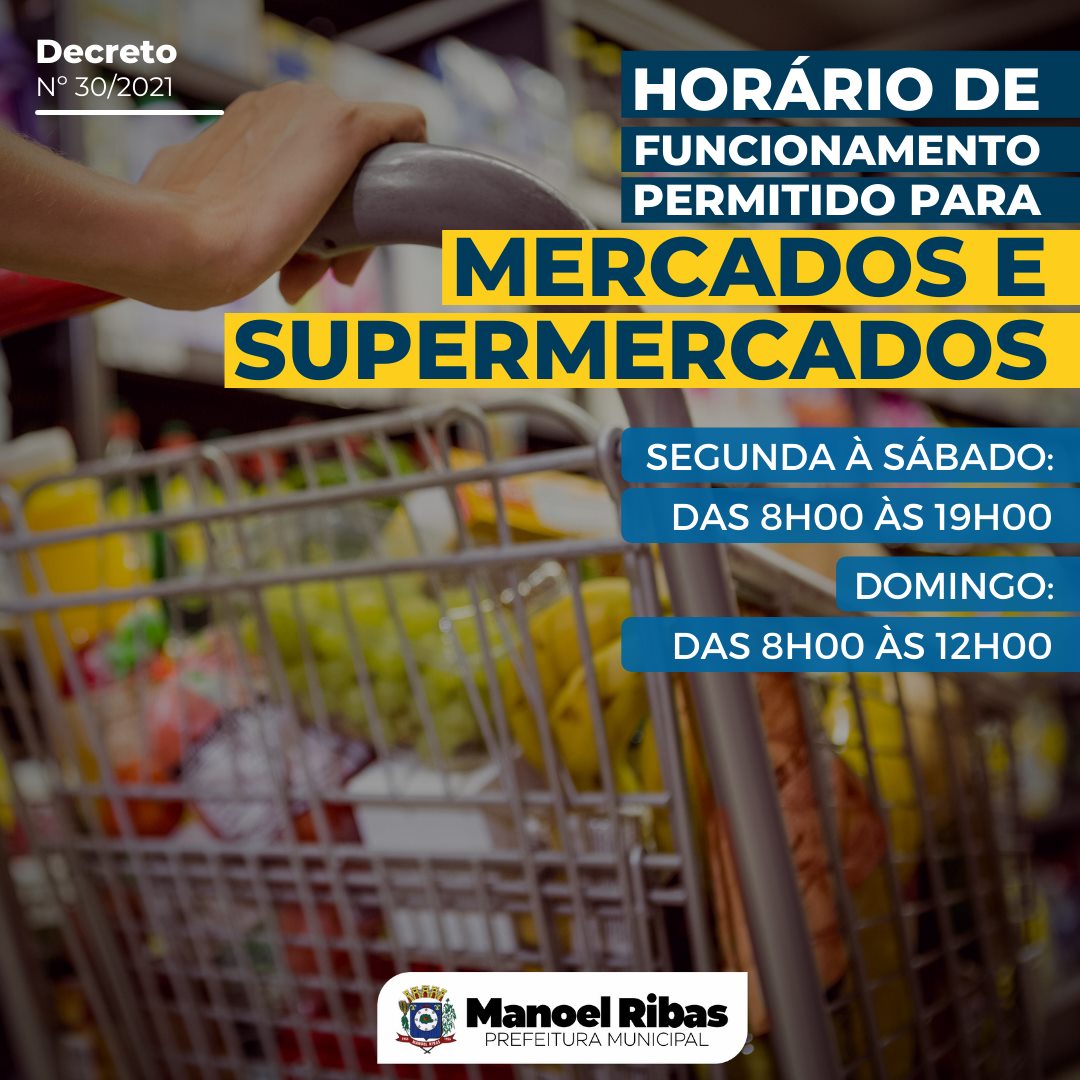 ATENÇÃO! Retificando o Decreto nº30/2021 postado anteriormente, alteramos o horário de funcionamento de Mercados e Supermercados. O horário de funcionamento permitido é de Segunda à Sábado das 8h00 às 19h00, e Domingos das 8h00 às 12:00.