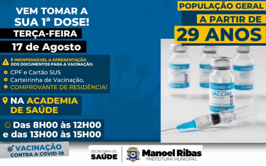 NOVA ETAPA DE VACINAÇÃO: PESSOAS DE 29 ANOS + 16/08/2021