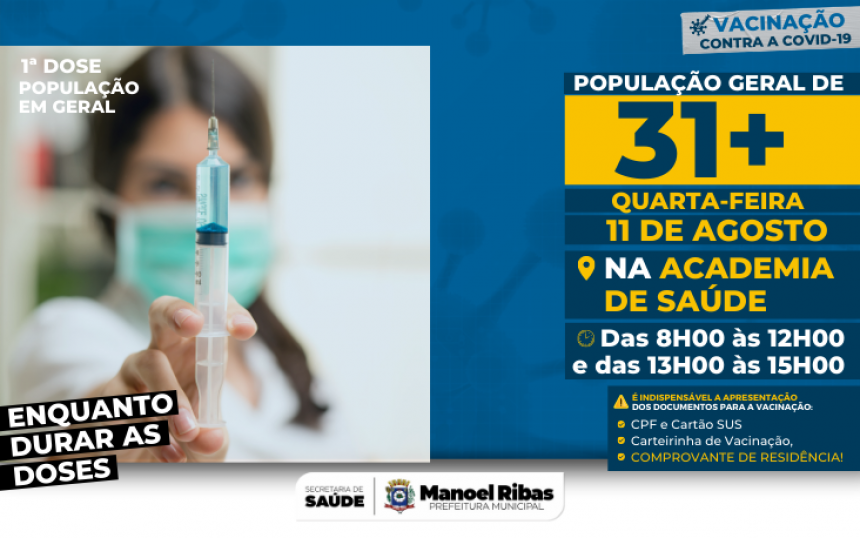 NOVA ETAPA DE VACINAÇÃO: PESSOAS DE 31 ANOS 11/08/2021