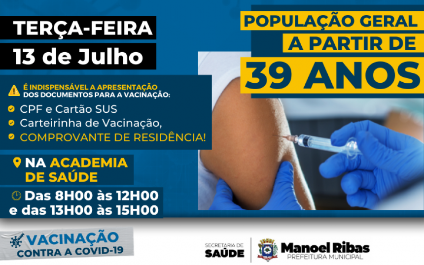 NOVA ETAPA DE VACINAÇÃO: PESSOAS DE 39 ANOS 12/07/2021